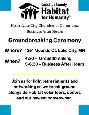 Join us for Business After Hours hosted by Goodhue County Habitat for Humanity on Wednesday, April 30 from 5:00–6:30 PM in Lake City.